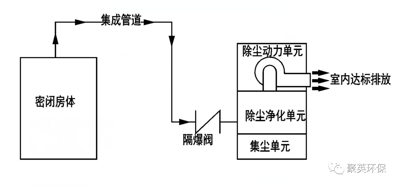 密闭房体 → 管道 → 防爆阀 → 除尘器 → 风机 → 烟囱(室内达标排放)