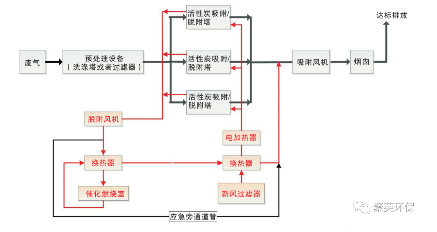 由环保离心风机将大风量、低浓度有机废气吸入活性炭吸附床,在吸附床内与多层蜂窝状活性炭充分净化(吸附),活性炭内部逐渐富集浓缩大量有机废物,而洁净的气体则排入大气;通过燃烧装置产生的高温气体经换热之后通入活性炭吸附床,使内部有机废物90℃高温气化从活性炭孔隙中逸散而出,此时的废气浓度远远高于初始吸附的废气浓度,然后进入催化燃烧装置(350℃)进行氧化分解成CO2和H2O等无害气体,气体经由热交换器将热量传递再次用于脱附,最后排入大气,以此完成一整套净化流程。