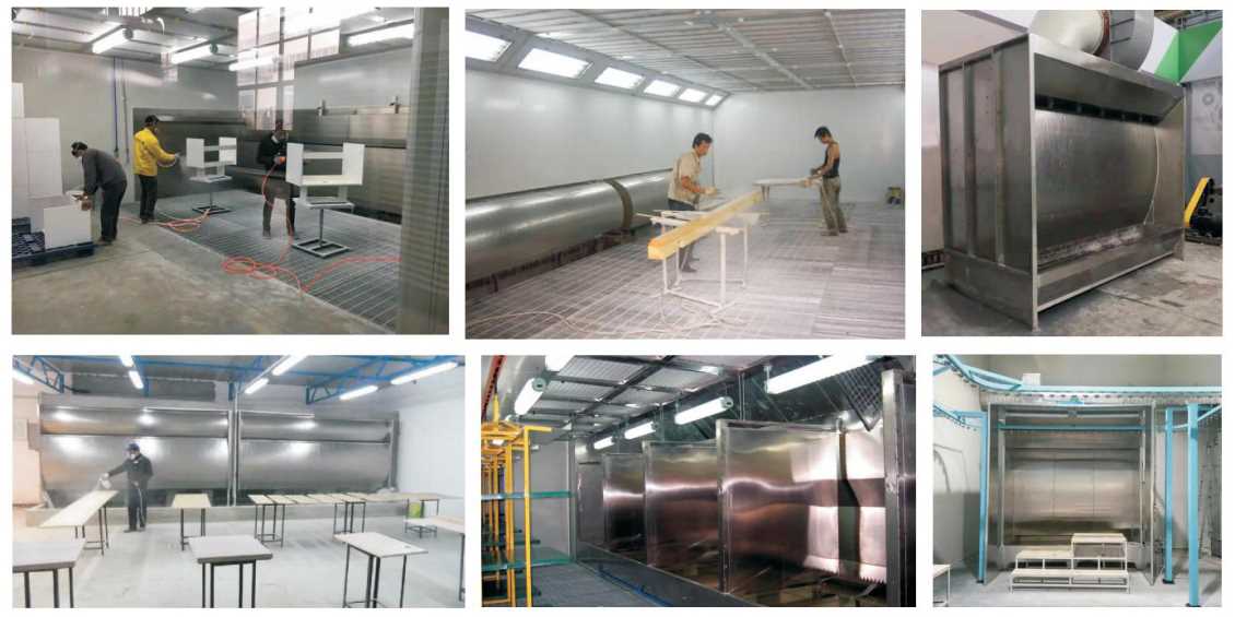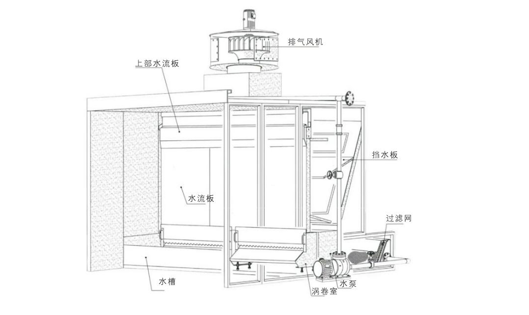 环保型水幕柜主要是由自吸水泵循环抽水往水帘板上均匀的流下来,使喷枪喷出来的漆雾和打磨产生的大颗粒粉尘被水帘板上的水打到下面水池里。再有少部分细微的漆雾和粉尘颗粒被末端的风机引入高效过滤器,通过排风管道排出车间外面或进行高空排放。